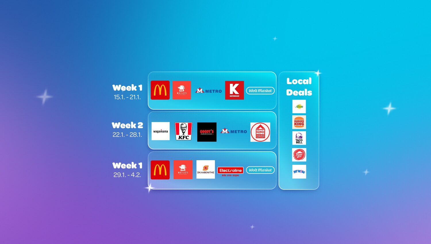 Για άλλη μια φορά η Wolt πρωτοπορεί, εισάγοντας στο Wolt+ Weeks, ένα εβδομαδιαίο σύστημα εναλλασσόμενων προσφορών που ανανεώνονται κάθε βδομάδα, καθώς και ένα ειδικό ημερολόγιο προσφορών. Με αυτό τον τρόπο, οι συνδρομητές της Wolt+ θα γνωρίζουν εκ των προτέρων τις επερχόμενες εκπτώσεις, ώστε να μπορούν να προγραμματίζουν τις αγορές τους, εξασφαλίζοντας συμφέρουσες προσφορές και χαμηλές τιμές.