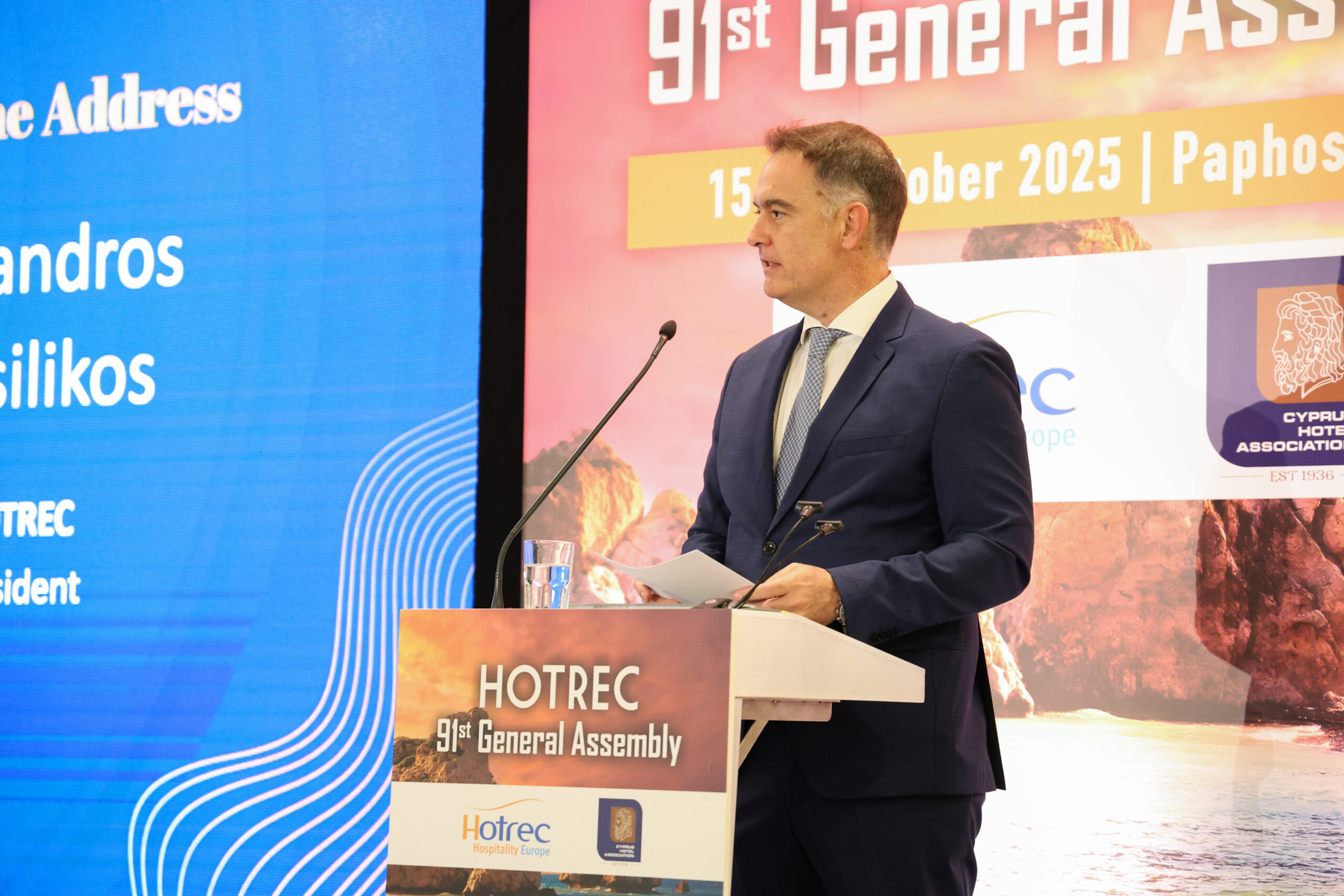 Σχετικά με την 91η Γενική Συνέλευση Hotrec που ξεκίνησε την Πέμπτη στην Πάφο στην παρουσία του ΠτΔ Νίκου Χριστοδουλίδη, ο κ. Βασιλικός είπε πως η Συνέλευση θα προσφέρει μια μοναδική πλατφόρμα για ανταλλαγή βέλτιστων πρακτικών, στρατηγικές συζητήσεις και συντονισμό πολιτικών και πρωτοβουλιών που επηρεάζουν τον κλάδο της φιλοξενίας σε ευρωπαϊκό επίπεδο.