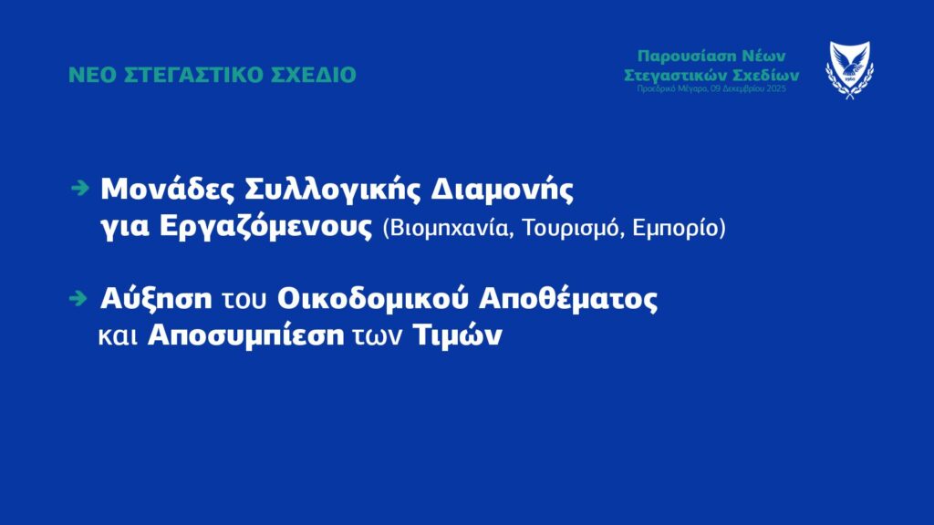 Ο Υπουργός Εσωτερικών Κωνσταντίνος Ιωάννου ανακοίνωσε νέο στεγαστικό σχέδιο για Μονάδες Συλλογικής Διαμονής, στοχευμένο σε εργαζομένους στους τομείς βιομηχανίας, τουρισμού και εμπορίου. Το σχέδιο προβλέπει δημιουργία εξειδικευμένων χώρων διαμονής με μειωμένο εμβαδόν, λιγότερους χώρους στάθμευσης και περιορισμένους κοινόχρηστους χώρους.
