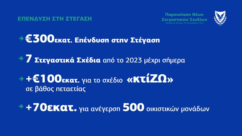 Ο Πρόεδρος ανέφερε ότι η στεγαστική πολιτική αποτελεί κορυφαία κυβερνητική προτεραιότητα, σημειώνοντας ότι η κυβέρνηση έχει ήδη προχωρήσει σε επενδύσεις άνω των €300 εκατ. την τελευταία τριετία. Τόνισε ότι η δαπάνη για στέγαση «είναι επένδυση» που προσφέρει ολιστικές λύσεις για εκατοντάδες νοικοκυριά.