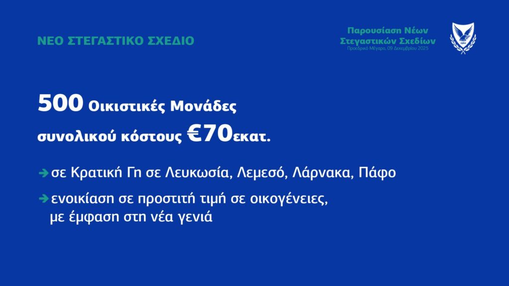 Οι νέες κατοικίες θα παραχωρούνται με προσιτό ενοίκιο σε οικογένειες και μονήρη άτομα, με έμφαση στη Νέα Γενιά, στο πλαίσιο των στεγαστικών σχεδίων που παρουσιάστηκαν σε εκδήλωση στο Προεδρικό Μέγαρο. Η ανέγερση θα γίνει μέσω πλειοδοτικού διαγωνισμού με τη μέθοδο Design and Build, ενώ η κυριότητα θα παραμείνει στο κράτος. Στη διαχείριση των μονάδων θα αξιοποιηθεί η τεχνογνωσία του Κυπριακού Οργανισμού Ανάπτυξης Γης.