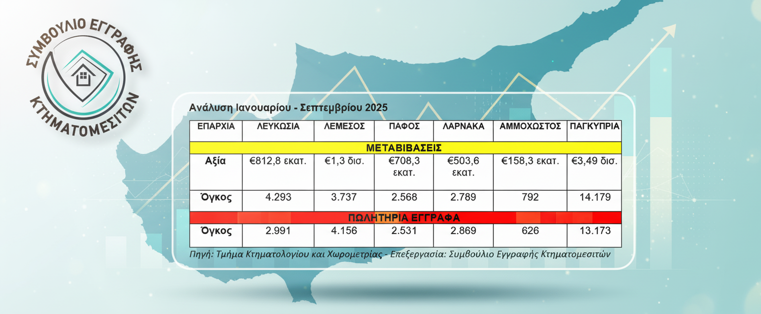 Η μεγάλη δυναμική της αγοράς ακινήτων αποτυπώνεται στις επιδόσεις που κατέγραψε το ενιάμηνο του 2025. Σε ετήσια βάση σημειώθηκε αύξηση της τάξης του 13% στον αριθμό των πωλητηρίων εγγράφων, που κατατέθηκαν Παγκύπρια την περίοδο Ιανουαρίου – Σεπτεμβρίου. Όπως καταδεικνύουν τα στοιχεία του Τμήματος Κτηματολογίου και Χωρομετρίας, τα οποία επεξεργάζεται και παρουσιάζει σε τριμηνιαία βάση το Συμβούλιο Εγγραφής Κτηματομεσιτών, κατατέθηκαν συνολικά 13.173 πωλητήρια έγγραφα σε σύγκριση με 11.634 το ενιάμηνο του 2024. Όσον αφορά στις μεταβιβάσεις, καταγράφηκε μικρή αύξηση στον όγκο κατά 0,74%, αλλά μεγάλη αύξηση της τάξης του 12,6% περίπου στην αξία τους, η οποία άγγιξε τα €3,49 δισ.