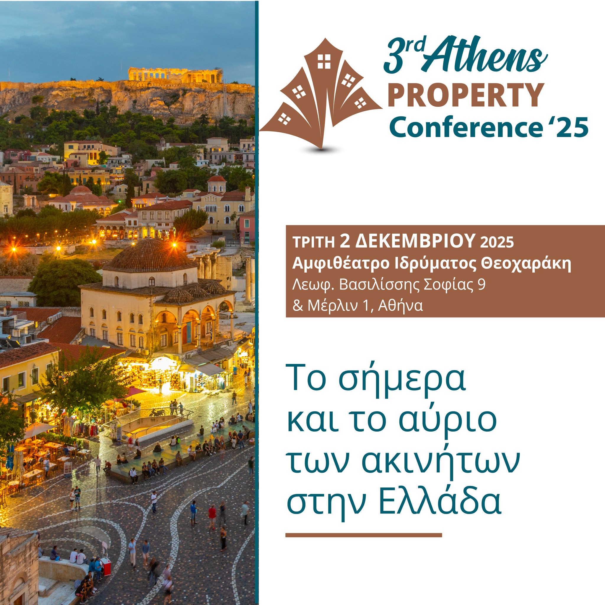 Το σήμερα και το αύριο των ακινήτων στην Ελλάδα είναι το θέμα του 3rd Athens Property Conference’25 που θα πραγματοποιηθεί την Τρίτη 2 Δεκεμβρίου και ώρα 10:00 – 15:00 στο Αμφιθέατρο του Ιδρύματος Θεοχαράκη στο κέντρο της Αθήνας.