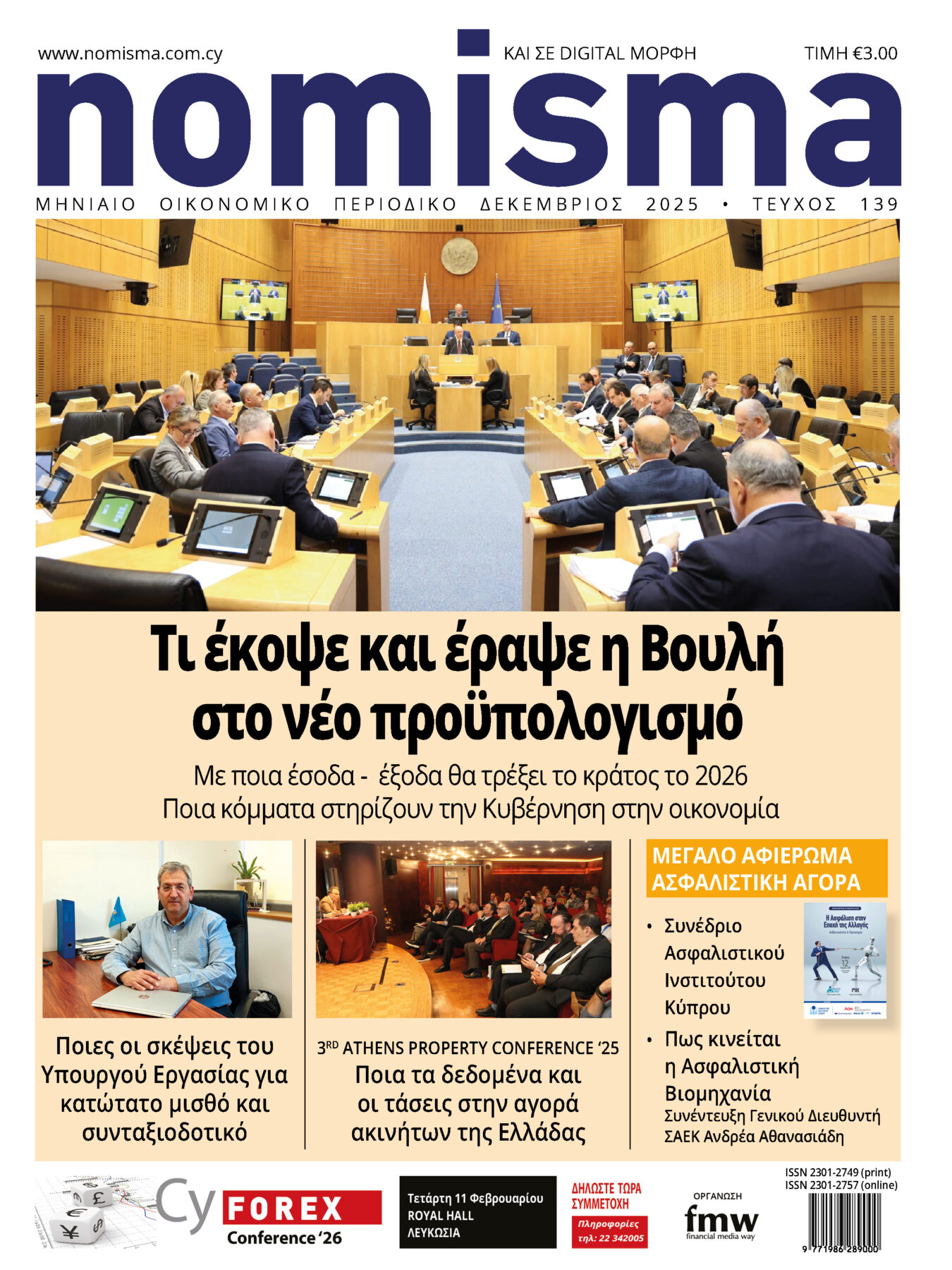 Όπως πάντα, το περιοδικό καλύπτει όλες τις εξελίξεις για τις τράπεζες, την αγορά και το Χρηματιστήριο, ενώ αποκλειστικά ρεπορτάζ και ειδικές αναλύσεις, περιλαμβάνονται στο νέο τεύχος του μηνιαίου οικονομικού περιοδικού nomisma. Μπορείτε να βρίσκετε κάθε μήνα το nomisma είτε εγγραφόμενοι ως συνδρομητές, είτε στα περίπτερα. Για περισσότερες λεπτομέρειες επικοινωνείτε με τα γραφεία μας, τηλ +357 22342005