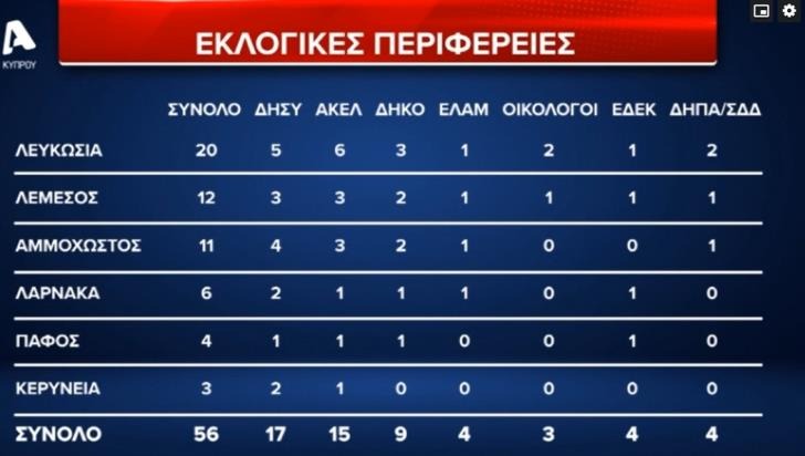 Σε σχέση με τις έδρες που καταλαμβάνουν τα κόμματα, 17 έδρες εξασφαλίζει ο Δημοκρατικός Συναγερμός, ενώ 15 έδρες εξασφαλίζει το ΑΚΕΛ, χάνοντας από μια έδρα.