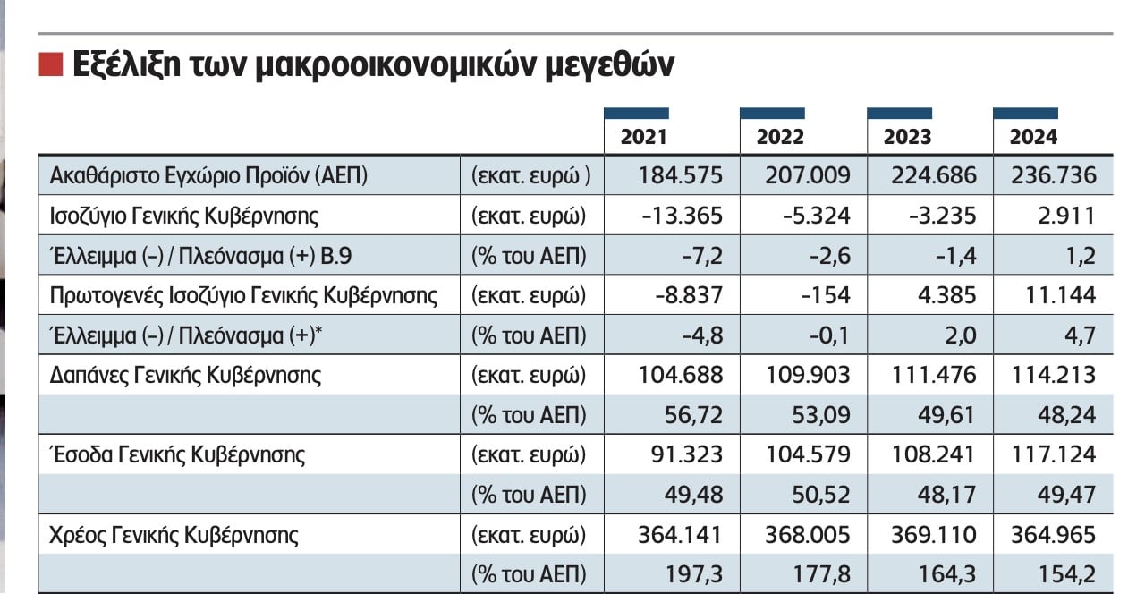 Οι δαπάνες της Γενικής Κυβέρνησης ανήλθαν στα 114,213 δισ. ευρώ, από 111,476 δισ. ευρώ το 2023, ενώ τα έσοδα της Γενικής Κυβέρνησης έφτασαν στα 117,124 δισ. ευρώ, από 108 δισ. ευρώ το 2023. Η δαπάνη για την υποστήριξη των χρηματοπιστωτικών ιδρυμάτων έφτασε, το 2024, στο 1,164 δισ. ευρώ ή στο 0,49% του ΑΕΠ, έναντι 999 εκατ. ευρώ το 2023 ή ποσοστό 0,4% του ΑΕΠ.