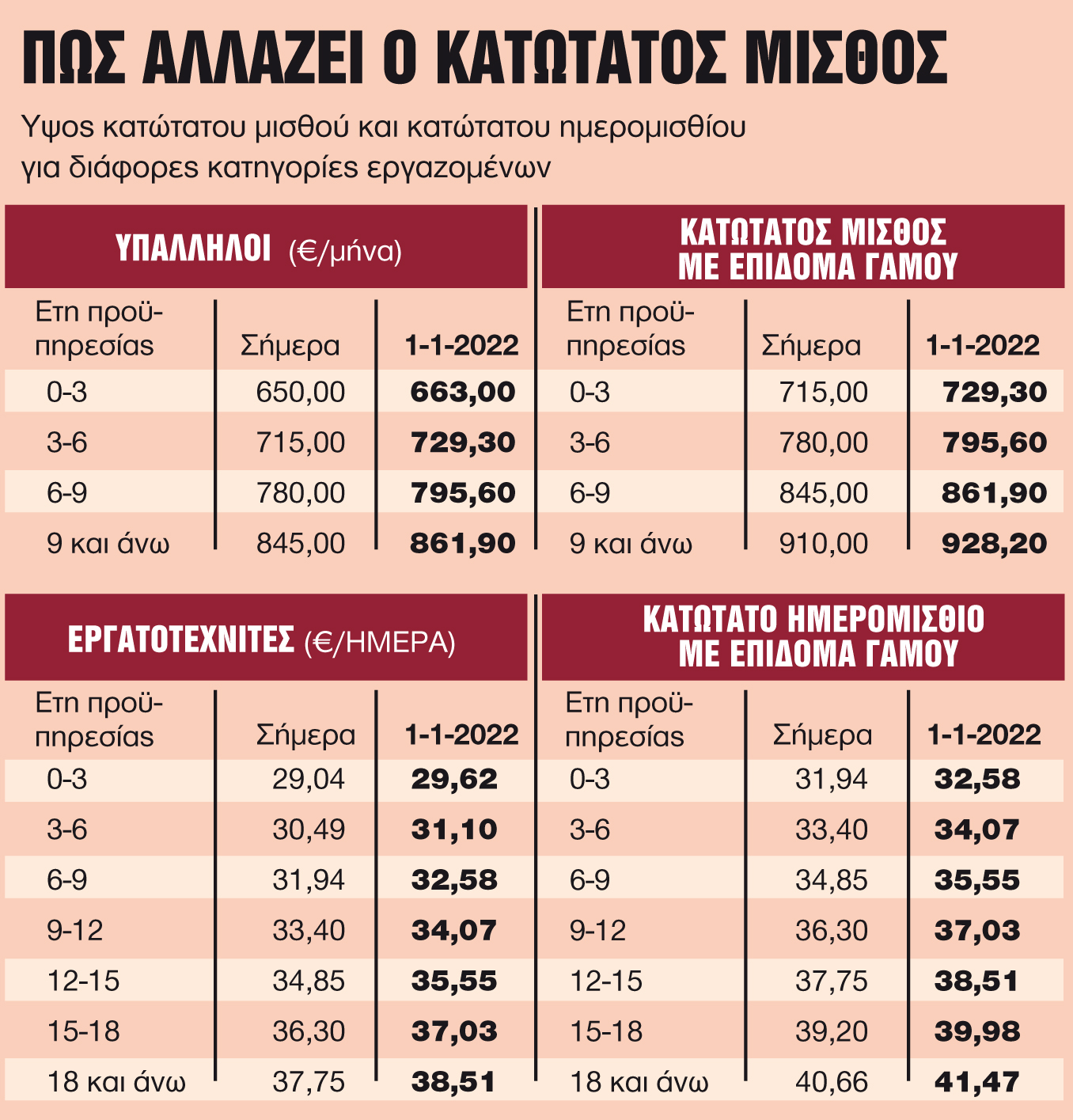 Ο νέος κατώτατος μισθός για τον εργαζόμενο του ιδιωτικού τομέα με 0 έως 3 χρόνια προϋπηρεσία διαμορφώνεται στα 663 ευρώ και με το επίδομα γάμου στα 729,30. Για τον μισθωτό με προϋπηρεσία από 3 έως 6 χρόνια διαμορφώνεται σε 729,3 ευρώ και με το επίδομα γάμου στα 795,60. Για τον μισθωτό με προϋπηρεσία από 6 έως 9 χρόνια διαμορφώνεται σε 795,6 ευρώ και με το επίδομα γάμου στα 861,60. Για τον μισθωτό με προϋπηρεσία άνω των 9 ετών διαμορφώνεται στα 861,9 ευρώ και με το επίδομα γάμου στα 928,20.