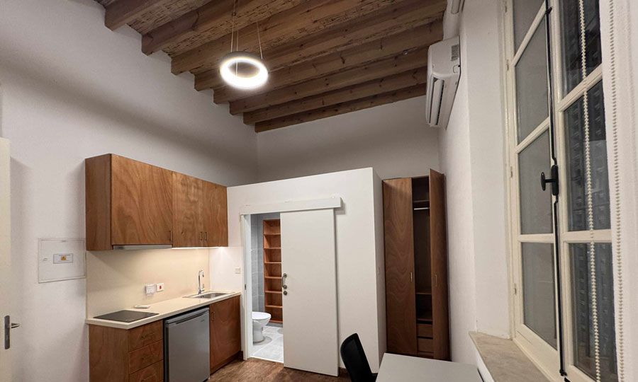 Πιο συγκεκριμένα, κάθε δωμάτιο είναι αυτόνομο και πλήρως επιπλωμένο, περιλαμβάνοντας γραφείο, καρέκλα γραφείου, ραφιέρα, κρεβάτι με συρτάρι και στρώμα πλάτους 90 εκ., κομοδίνο και ντουλάπι τοίχου στο μπάνιο. Διαθέτει επίσης ατομικό χώρο υγιεινής και πλήρως εξοπλισμένη κουζίνα. Επιπλέον, κάθε δωμάτιο διαθέτει κλιματιστικό θέρμανσης/ψύξης.