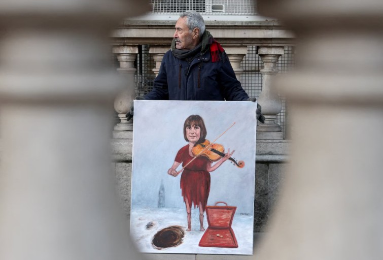 Ο καλλιτέχνης Kaya Mar κρατάει καρικατούρα που απεικονίζει την Βρετανίδα ΥΠΟΙΚ