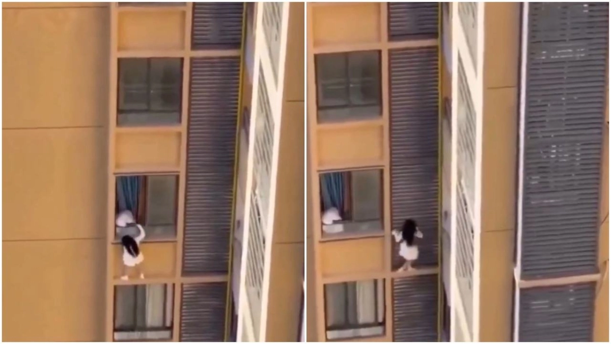 Σε βίντεο που κατέγραψαν γείτονες, η ερωμένη φαίνεται να κρέμεται στο κενό από τον 10ο όροφο της πολυκατοικίας, με τον δρόμο να απλώνεται επικίνδυνα από κάτω της. Οι αυτόπτες μάρτυρες ακούγονται να φωνάζουν έντρομοι, καθώς η γυναίκα παλεύει να κρατηθεί.