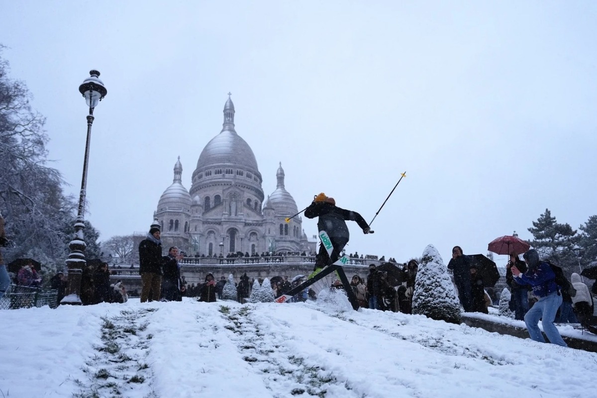 Η χιονισμένη Μονμάρτρη, ωστόσο, πρόσφερε μια σπάνια εικόνα του Παρισιού, μετατρέποντας για λίγες ώρες έναν από τους πιο εμβληματικούς λόφους της πόλης σε αυτοσχέδια «πίστα σκι».