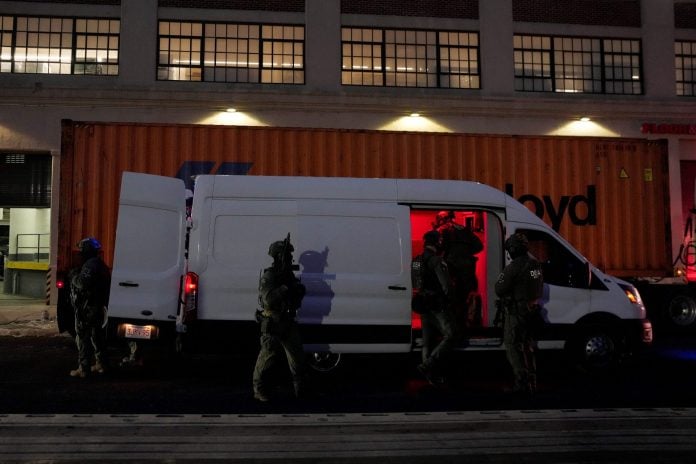 Είχε προηγηθεί μία απίστευτη μεταγωγή, βγαλμένη από «κινηματογραφικές» επιχειρήσεις της DEA κατά ναρκεμπόρων. Με χειροπέδες, αμφίεση που παραπέμπει σε φόρμα κρατουμένου, τον ίδιο να στραβοπατά ή να χωλαίνει λίγα μέτρα πίσω από την προπορευόμενη σύζυγό του Σίλια Φλόρες, ο ανατρααπείς ισχυρός άνδρας της Βενεζουέλας οδηγήθηκε το μεσημέρι της Δευτέρας από το κέντρο κράτησης στο Μπρούκλιν -με ελικόπτερο- στο ομοσπονδιακό δικαστήριο του Μανχάταν.