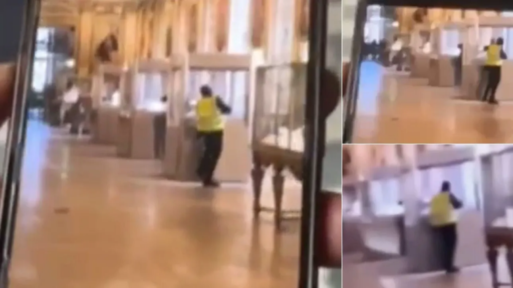 Έτσι ενώ ο άνδρας με το κίτρινο γιλέκο πριονίζει την προθήκη στη γκαλερί «Απόλλων», μέσα σε μόλις 7 λεπτά καταφέρνει να αρπάξει εννέα κοσμήματα ανεκτίμητης αξίας από τη συλλογή του Ναπολέοντα και της Αυτοκράτειρας Ευγενίας –συμπεριλαμβανομένων ενός κολιέ, μιας καρφίτσας και μιας τιάρας– τα οποία ήταν ανάμεσα στα εκθέματα.