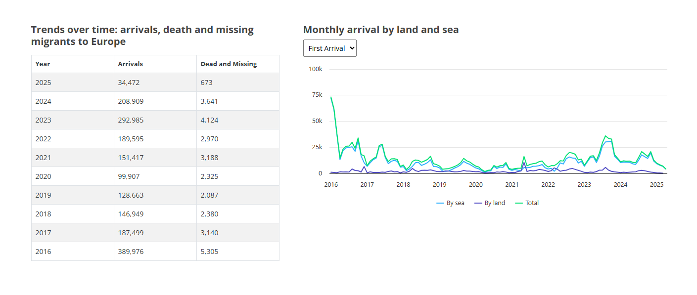 Σύμφωνα με τα στοιχεία του ΔΟΜ (Διεθνής Οργανισμός Μετανάστευσης) από τον Ιανουάριο μέχρι τον Απρίλιο του 2025 κατάφεραν έφτασαν στην Ευρώπη μόλις 34.472 μετανάστες και πρόσφυγες.
