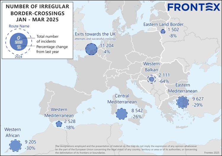 Σύμφωνα με τα στοιχεία της Frontex οι παράτυπες διελεύσεις μεταναστών στην Ευρώπη μειώθηκαν κατά 30% το πρώτο τρίμηνο του 2025 σε σύγκριση με την ίδια περίοδο πέρυσι. Η μείωση παρατηρήθηκε σε όλες τις κύριες μεταναστευτικές οδούς προς την Ευρώπη και ανήλθε σε σχεδόν 33.600 λιγότερες αφίξεις τους πρώτους τρεις μήνες του έτους.