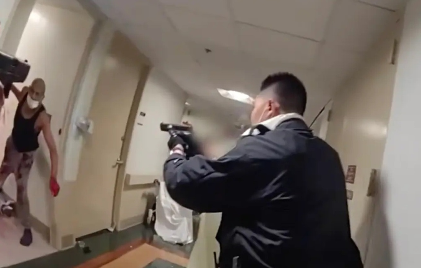Σύμφωνα με την αστυνομία, ο 62χρονος Μάικλ Λιντς, ασθενής του νοσοκομείου και πρώην αστυνομικός της NYPD που είχε παραιτηθεί τη δεκαετία του 1990, είχε σπάσει ένα κομμάτι από λεκάνη τουαλέτας και το χρησιμοποιούσε ως αυτοσχέδιο μαχαίρι. Στο βίντεο φαίνονται αστυνομικοί να περικυκλώνουν το μισάνοιχτο δωμάτιο, φωνάζοντάς του επανειλημμένα να «ρίξει το μαχαίρι», ενώ εκείνος στεκόταν πίσω από την πόρτα, καλυμμένος με αίματα.