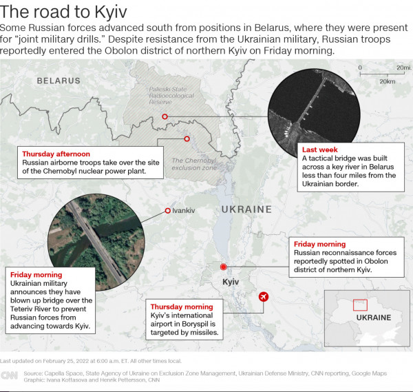 Το ρωσικό υπουργείο Άμυνας ανακοίνωσε ότι οι δυνάμεις του έχουν ελέγξει το βασικό αεροδρόμιο Hostomel κοντά στο Κίεβο. Όπως ισχυρίζεται, 200 ρωσικά ελικόπτερα και μια δύναμη από την ξηρά χρησιμοποιήθηκαν για την κατάληψή του. Σύμφωνα με την ίδια ανακοίνωση, το Κίεβο είναι αποκλεισμένο από δυτικά.